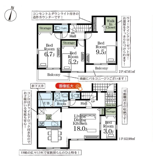 | 設備・条件 | 設計住宅性能評価書 建設住宅性能評価書 長期優良住宅 制震・免震・耐震 LDK18帖以上 床下収納 ウォークインクローゼット 浄水器 浴室乾燥機 浴室に窓 温水洗浄便座 トイレ2か所 シャワー付き洗面化粧台 バルコニー2面以上 TVモニター付インターホン フラット35対応 年度内入居可 24時間換気システム 都市ガス 基礎パッキン工法、玄関収納 |
