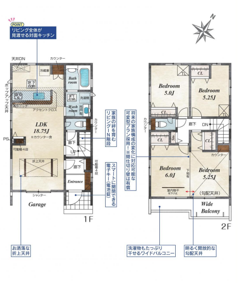 給湯器、折上天井、在来工法、火災報知器、造作ニッチ、フローリング、手すり付き階段、低ホルムアルデヒド収納下駄箱(鏡付)